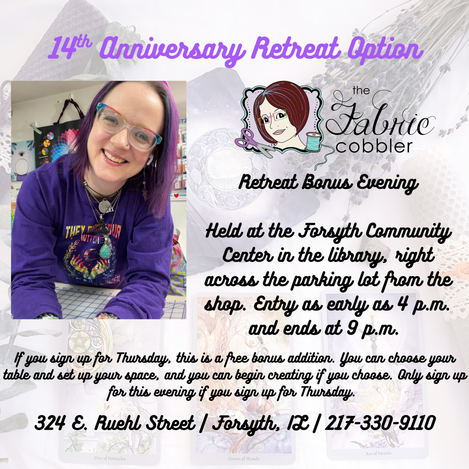 If you sign up for Thursday, this is a free bonus addition. You can choose your table and set up your space, and you can begin creating if you choose. Only sign up for this evening if you sign up for Thursday.